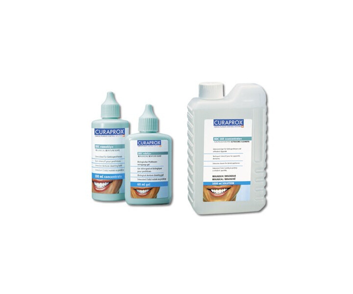 Curaprox-Mundpflegesystem für Menschen mit Prothesen. Die biologische Wirkungsweise von Curaprox BDC (Biological Denture Care) daily und weekly: Zitronensäure löst krankmachende Prothesenbeläge (Plaques) auf, schont aber den Prothesenkunststoff. In ...