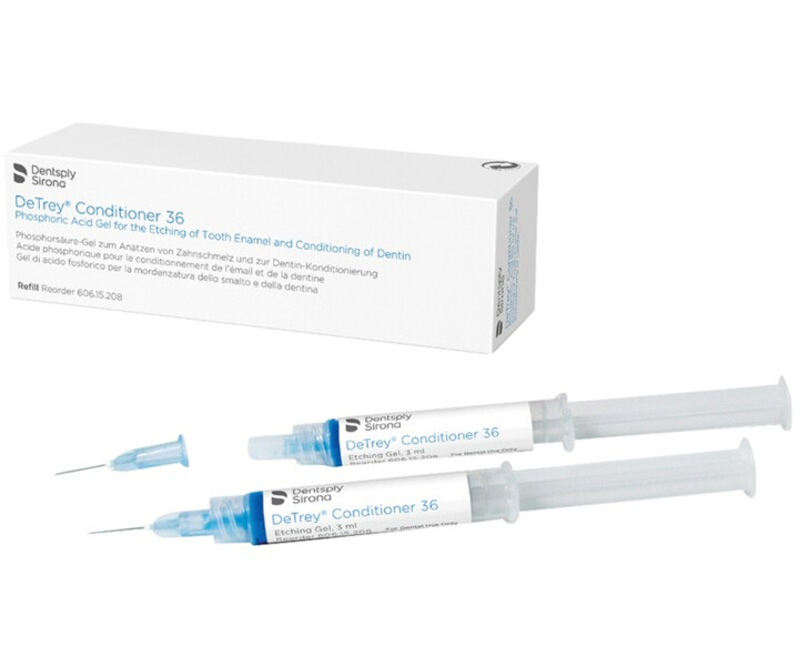 DeTrey Conditioner 36 ist ein blau-gefärbtes Gel mit 36% Phosphorsäure. Es dient dem Ätzen von Zahnschmelz und der Dentinkonditionierung vor dem Bonding.