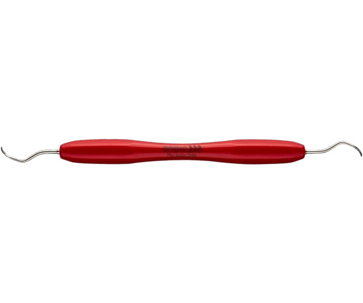 Doppelendige Parodontologie-Handinstrument mit farbcodiertem, ergonomisch geformtem Silikongriff. Die Modellnummer des Instruments ist per Laser in den Instrumentenschaft eingraviert.
