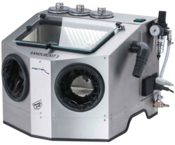 Abstrahlen, Typ Zweikammer-Feinstrahlgerät, Breite 480 mm, Tiefe 440 mm, Höhe geöffnet maximal 480 mm, Körnung 25 - 250 mµ, Gewicht 17 kg